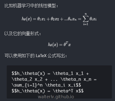 \[h_\theta(x) = \theta^T x\]可以使用如下的 LaTeX 公式写出: