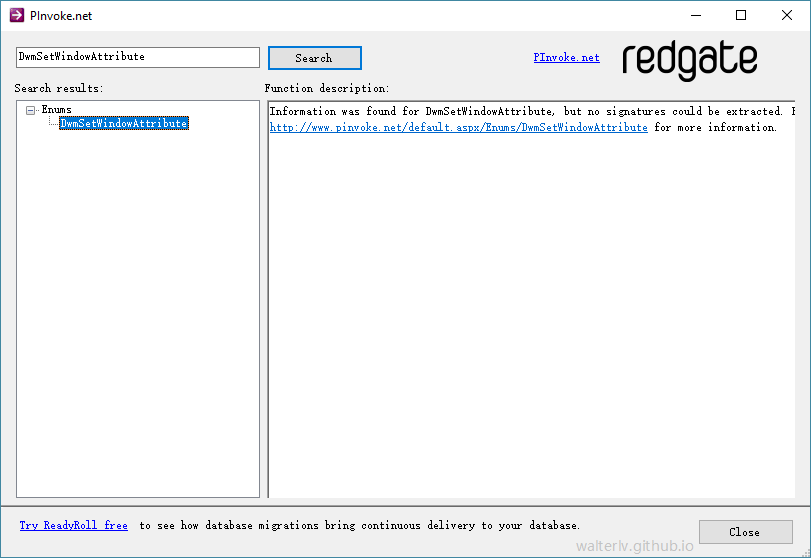 不过,插件内所带的 P/Invoke 函数似乎并不够多,因为对于 DwmSetWindowAttribute 这样的函数并没有在插件中出现。不过 https://www.pinvoke.net/ 中是包含的。
