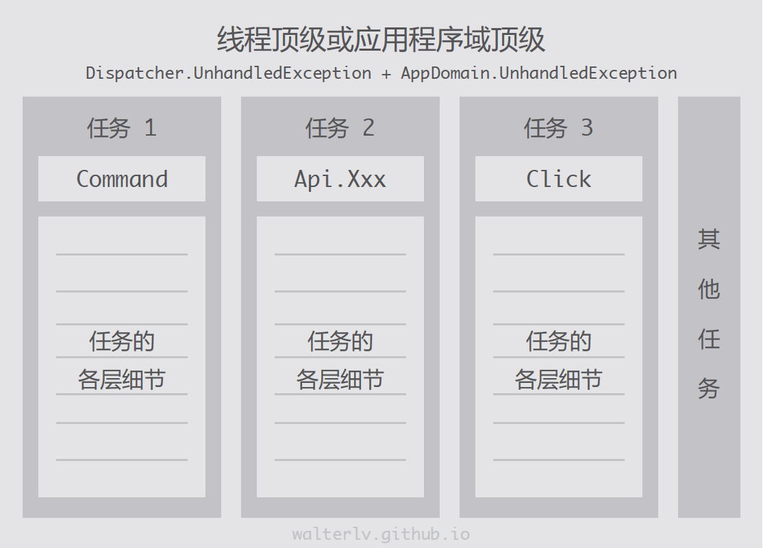 Dispatcher.UnhandledException 可以处理掉当前 UI 线程上未经处理的异常;AppDomain.UnhandledException 可以让我们知道当前应用程序域中所有未经处理的异常。